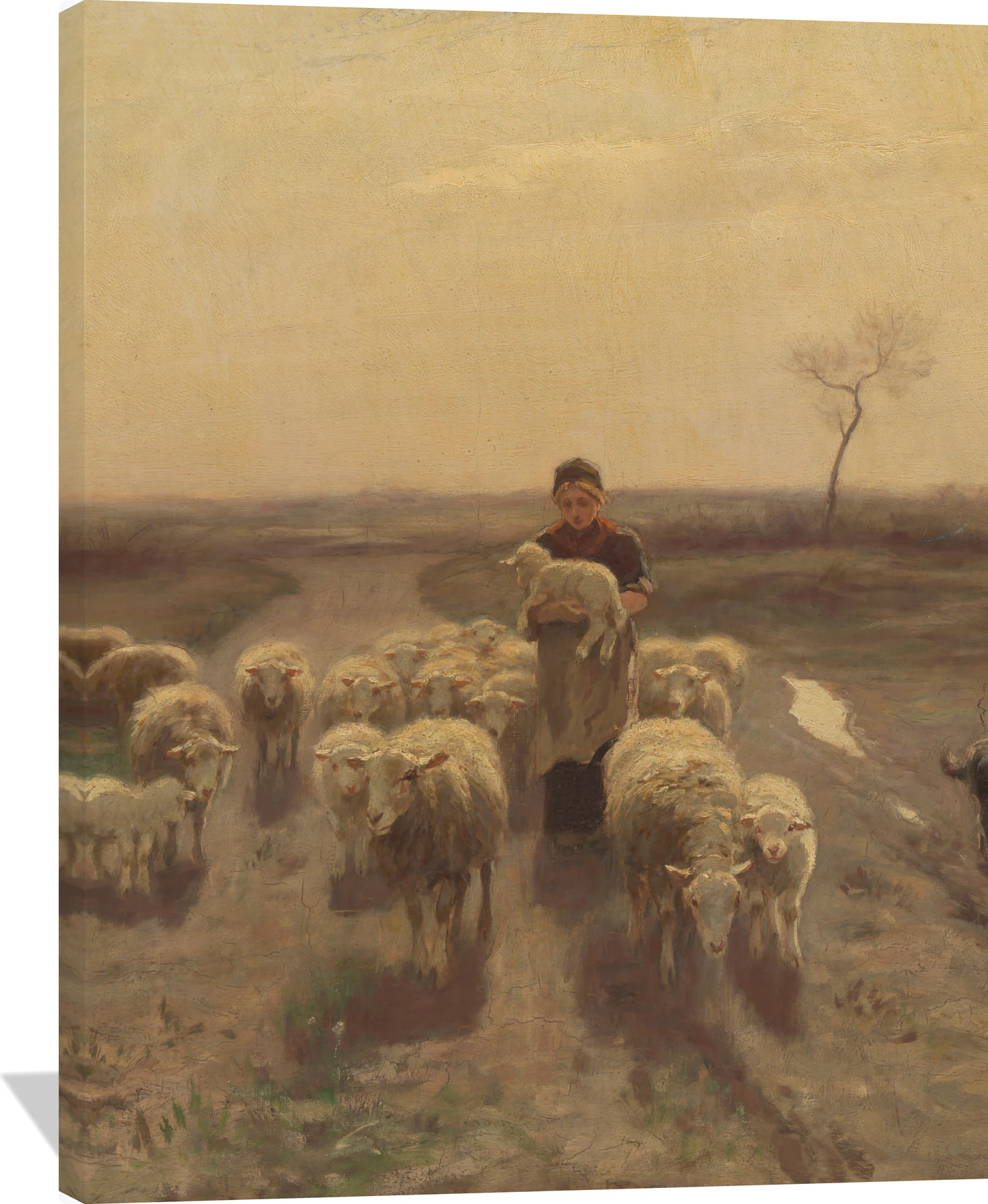 The Anton Mauve A Shepherdess and Her Flock canvas captures a serene pastoral moment bathed in golden light. A young shepherdess guides her sheep along a quiet country path, surrounded by soft earth tones of ochre, cream, and muted green. Mauve’s masterful brushwork and gentle realism evoke the calm rhythm of rural life and the warmth of a fading afternoon.