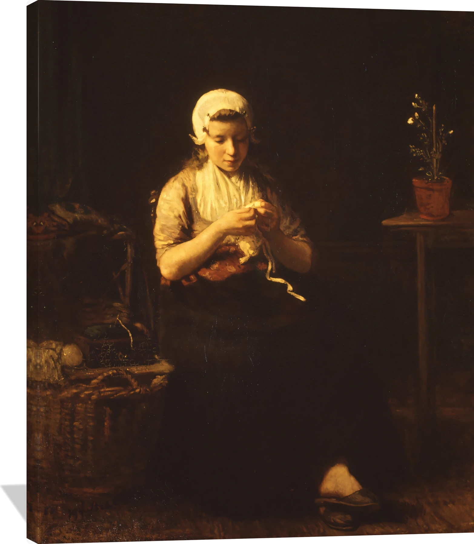 The Jozef Israëls Expectation canvas captures a quiet moment of introspection, rendered in warm earth tones of amber, umber, and soft cream. A young woman, bathed in gentle light, sits absorbed in her handiwork, surrounded by the stillness of a humble interior. Israëls’ masterful use of shadow and texture evokes both tenderness and timeless dignity.