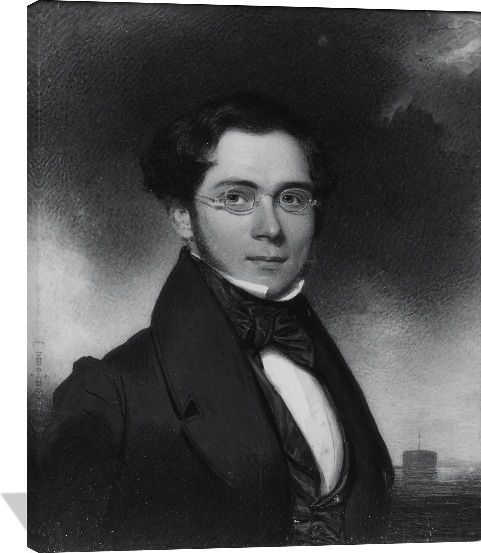 The Thomas Seir Cummings Gustavus Adolphus Rollins canvas captures the quiet dignity of 19th‑century portraiture with refined precision. Rendered in deep charcoal, soft ivory, and muted gray tones, the work highlights the sitter’s composed expression and elegant attire against a subtly atmospheric background. Cummings’ masterful control of light and texture lends the piece a timeless sophistication.