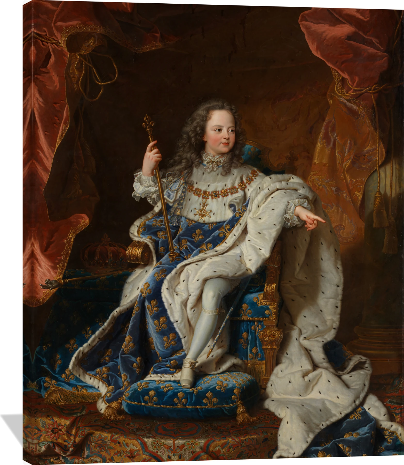 The Hyacinthe Rigaud Louis XV (1710–1774) as a Child canvas captures the youthful monarch in regal splendor, draped in blue and gold fleur-de-lis robes beneath rich crimson drapery. Rigaud’s masterful brushwork and luminous palette convey both innocence and authority, embodying the grandeur of the French court. The warm tones and intricate textures bring a sense of timeless elegance to any interior.