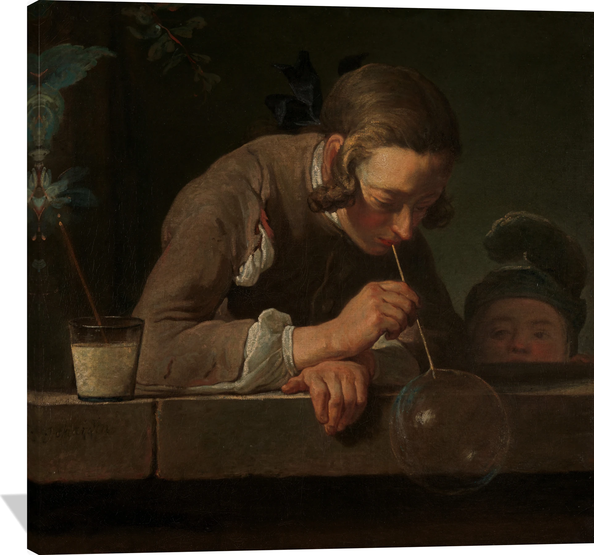 The Jean Siméon Chardin Soap Bubbles canvas captures a fleeting moment of youthful wonder with exquisite realism. In soft tones of warm brown, muted green, and gentle cream, a young figure leans over a ledge, carefully forming a delicate bubble that glows with subtle light. Chardin’s masterful use of shadow and texture evokes quiet contemplation and the fragile beauty of everyday life.