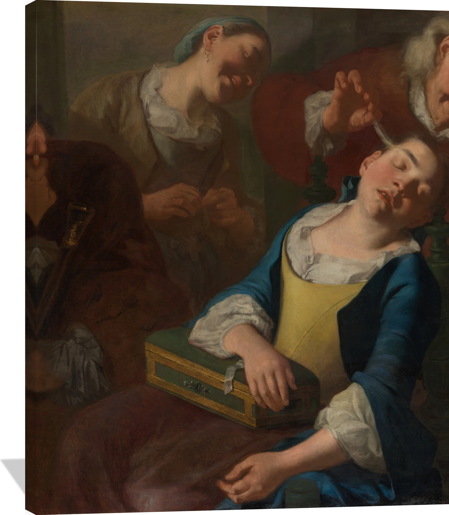 The Gaspare Traversi Teasing a Sleeping Girl canvas captures a moment of playful mischief rendered with exquisite Baroque detail. Warm browns, deep blues, and soft golden tones create a rich, intimate atmosphere as figures gather around a dozing young woman, their expressions alive with humor and intrigue. Traversi’s masterful use of light and shadow brings both tenderness and wit to this lively domestic scene.