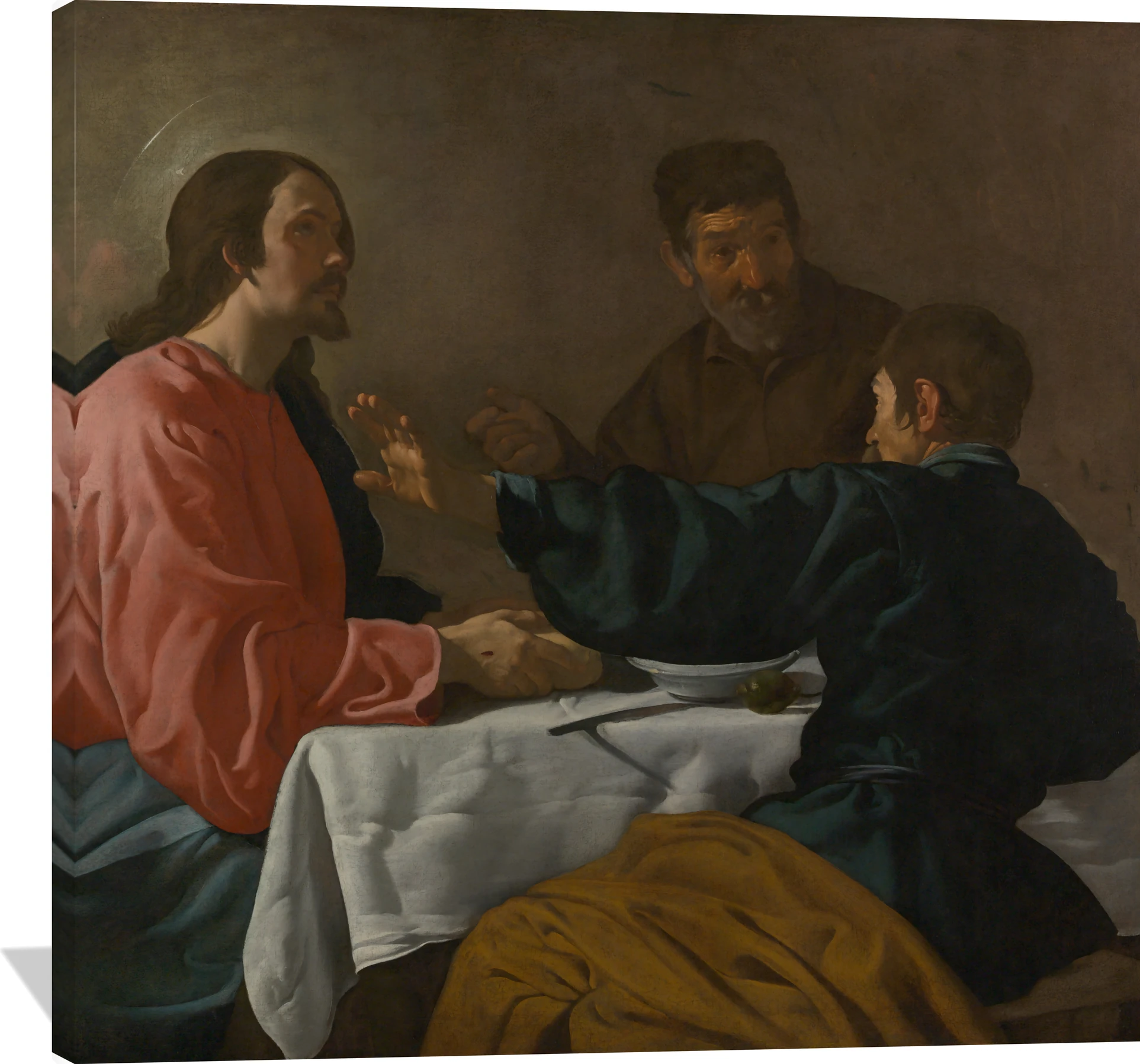 The Velázquez The Supper at Emmaus canvas captures a moment of divine revelation with masterful restraint and emotional depth. Warm earth tones, deep teal, and soft rose hues emerge from the shadows, highlighting the quiet tension and wonder shared around a simple table. The composition’s balanced light and intimate realism make it a timeless centerpiece for contemplation.