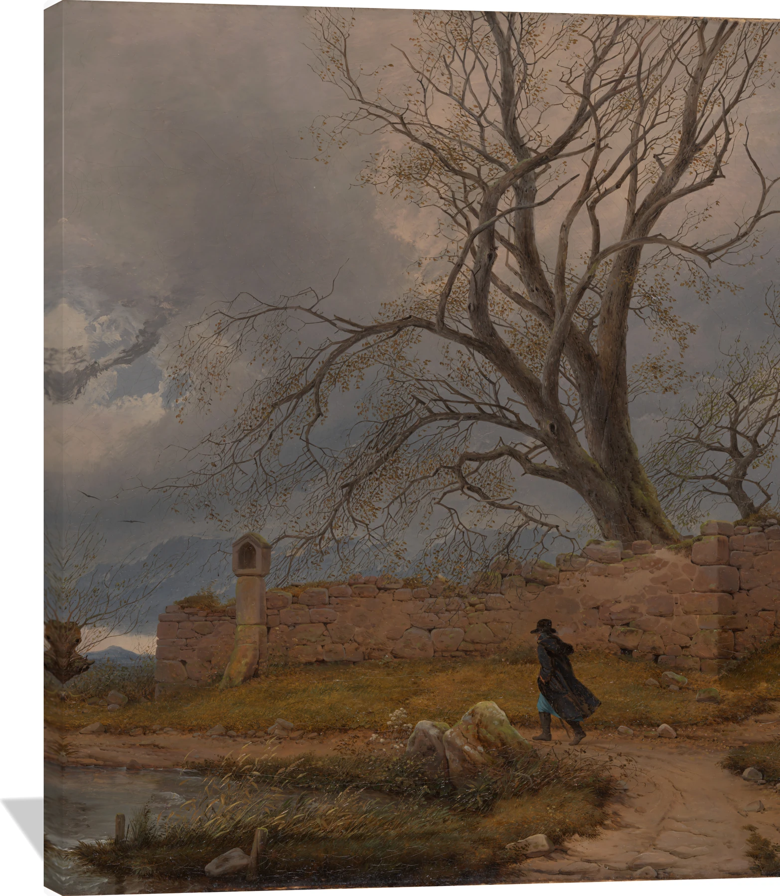The Julius von Leypold Wanderer in the Storm canvas captures the haunting beauty of a lone traveler braving turbulent skies. Rendered in earthy browns, muted blues, and soft grays, this Romantic landscape evokes both solitude and resilience. The sweeping composition and masterful light contrast invite quiet reflection, making it a timeless statement piece for any interior.