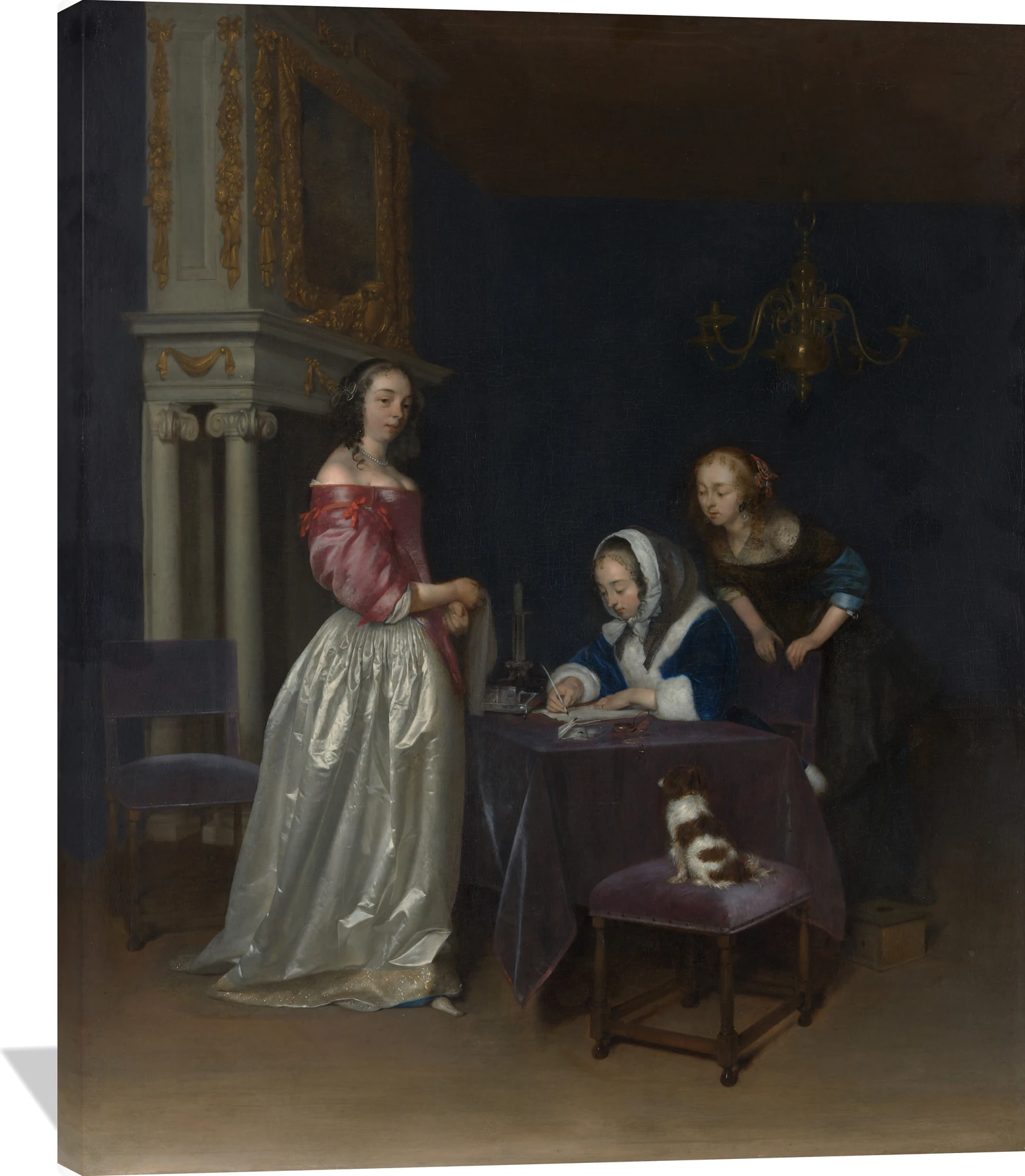 The Gerard ter Borch the Younger Curiosity canvas captures an intimate 17th-century interior scene, where three elegantly dressed women engage in quiet intrigue. Rendered in soft tones of deep blue, ivory, rose, and gold, this masterwork reflects the artist’s refined realism and delicate handling of light and texture. The composition’s calm atmosphere and subtle narrative invite contemplation and add timeless sophistication to any space.