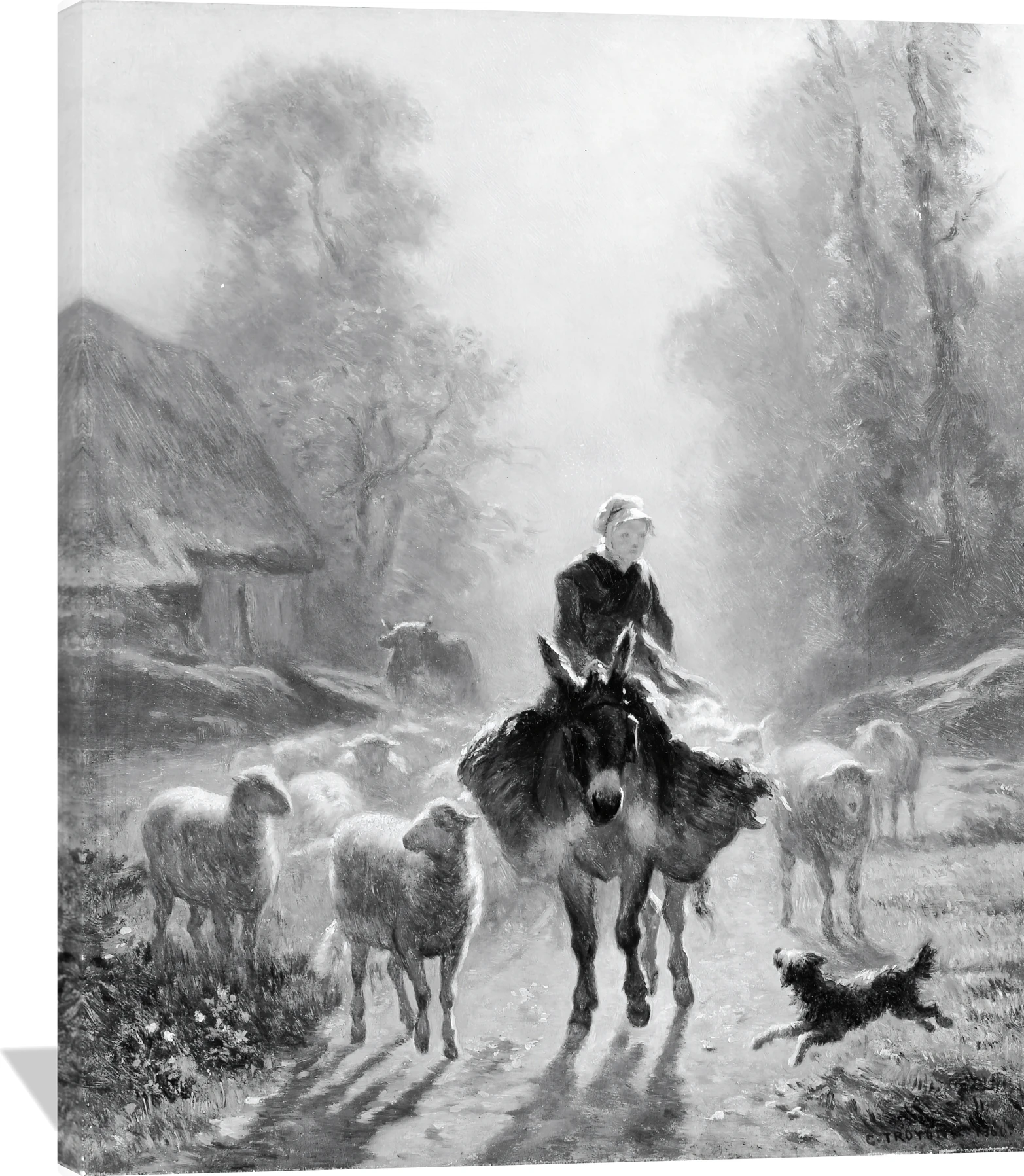 The Constant Troyon Going to Market canvas captures a tranquil rural morning bathed in soft light. A woman on a donkey leads her flock along a country path, framed by tall trees and rustic cottages. Earthy tones of warm browns, muted greens, and silvery grays evoke the calm rhythm of pastoral life, rendered with Troyon’s signature realism and gentle luminosity.