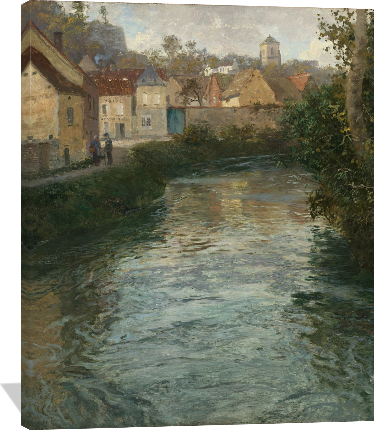 The Frits Thaulow Picquigny canvas captures a tranquil riverside village bathed in soft daylight, where rippling water reflects the charm of rustic houses and autumnal trees. Gentle tones of moss green, muted gold, slate blue, and warm ochre create a serene balance between nature and architecture, inviting quiet contemplation.