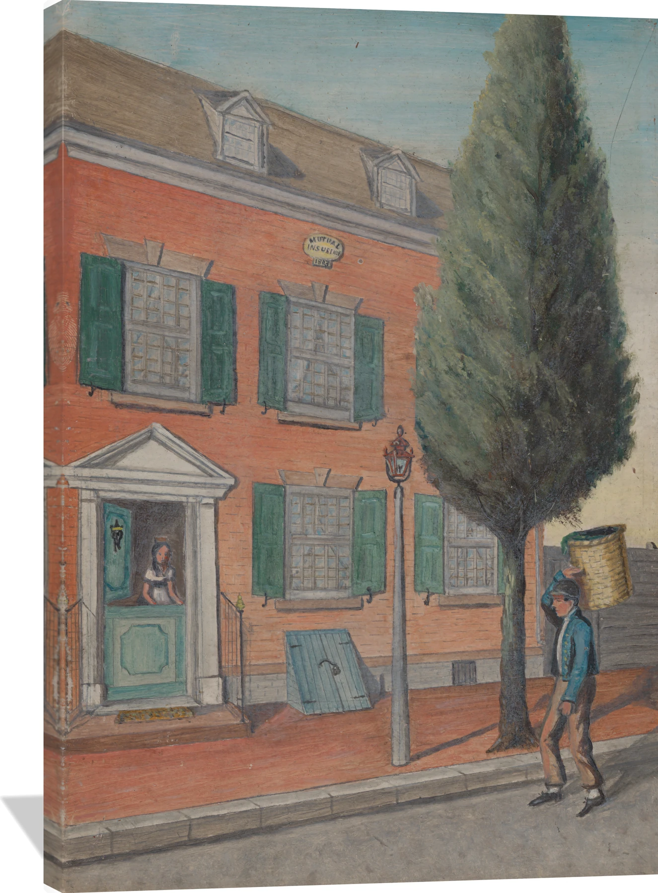 The William P. Chappel Tea Rusk and Brick House canvas captures a charming slice of 19th-century American life with quiet elegance. The warm brick façade, deep green shutters, and soft blue sky create a balanced palette that evokes nostalgia and calm. A lone figure walking past the stately home adds a touch of everyday realism to the scene’s timeless appeal.