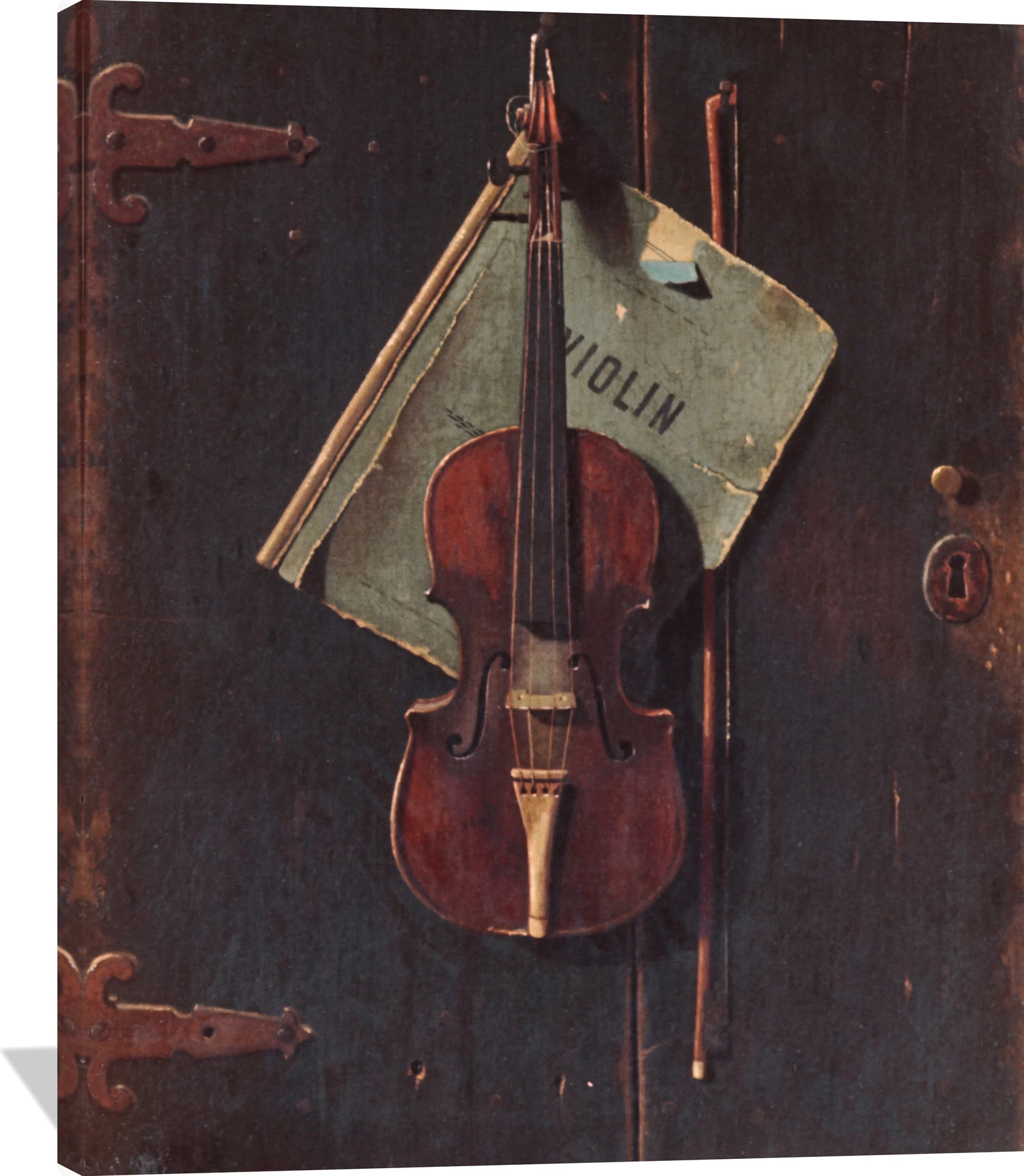 The John F. Peto The Old Cremona canvas captures the quiet poetry of a well-loved violin resting against aged wood, accompanied by a worn sheet of music. Rich mahogany, deep umber, and muted green tones create a warm, nostalgic atmosphere that evokes timeless craftsmanship and devotion to art.