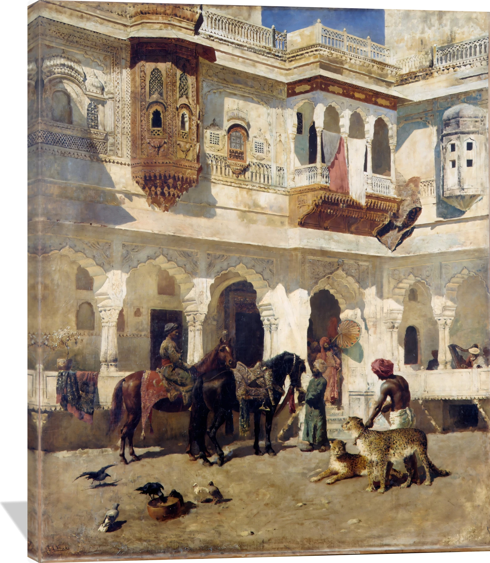 Edwin Lord Weeks’ The Rajah Starting on a Hunt canvas captures the grandeur and anticipation of a royal departure within a sunlit palace courtyard. Bathed in warm ochres, soft creams, and deep terracottas, the scene unfolds with richly adorned horses, attendants, and leopards poised for the hunt, framed by intricate Mughal architecture under a clear blue sky.